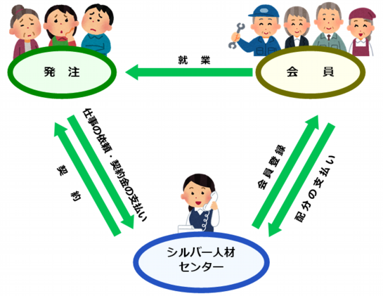 発注者(ご依頼主)から高年齢者にふさわしい仕事をセンターが請負又は委任契約により引き受け、登録している会員が仕事を完成させます。 そのため、発注者(ご依頼主)と会員との間には雇用関係は発生しません。