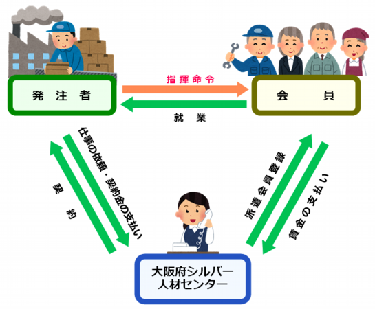 シルバー派遣事業は、シルバー会員を派遣労働者とし、公益社団法人大阪府シルバー人材センター協議会と派遣契約を締結し、「臨時的かつ短期的な就業又は軽易な業務」の範囲内で、派遣先の指揮命令によって働くものです。